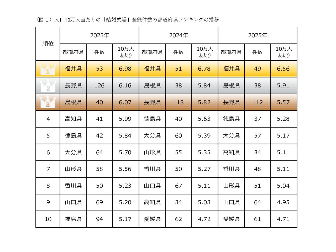 2025年における人口10万人あたりの結婚式場の登録件数が最も多い地域は、10万人あたり6.56件の式場がある福井県です。続いて10万人あたり5.91件の島根県。3位は10万人あたり5.57件の長野県となりました。