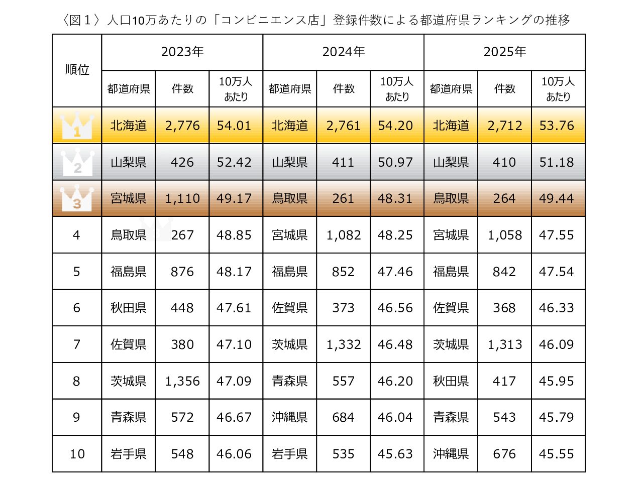 続いて、2023年から2025年にかけての都道府県別のコンビニ登録件数の推移と10万人あたりのコンビニ登録件数の調査結果をご紹介します。