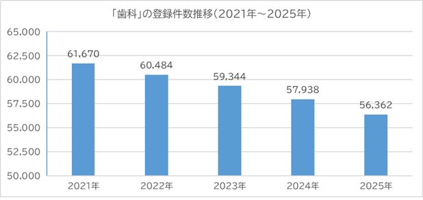 はじめに、2021年から2025年までの全国の歯科の登録件数の推移データをご紹介します。