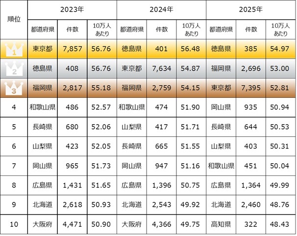 人口10万人あたりの歯科の登録件数のTOP3に、3年連続で徳島県・福岡県・東京都の3都県がランクインしています。2025年の順位は、1位が10万人あたり54.97件の徳島県、2位が10万人あたり53件の福岡県、3位が10万人あたり52.81件の東京都です。徳島県は2024年のランキングでも10万人あたりで1位につけています。