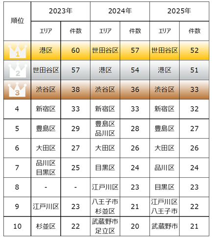 2025年において東京都でスポーツクラブの登録件数が多い地域は、世田谷区、港区、渋谷区の3地域の順となりました。2023年から2025年にかけての3年間、順位に変動はあるもののTOP3を維持しています。これらに新宿区、豊島区、品川区、目黒区を加えた計7地域は2023年から順位を維持しています。