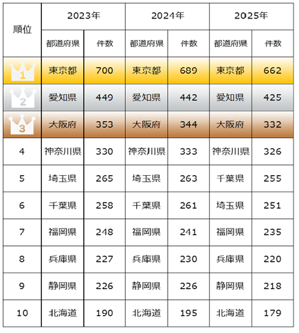 2025年でスポーツクラブの登録件数の多い都道府県は、1位が東京都、2位が愛知県、3位が大阪府となりました。これら3地域を含む上位10地域は、2023年から順位を維持しています。