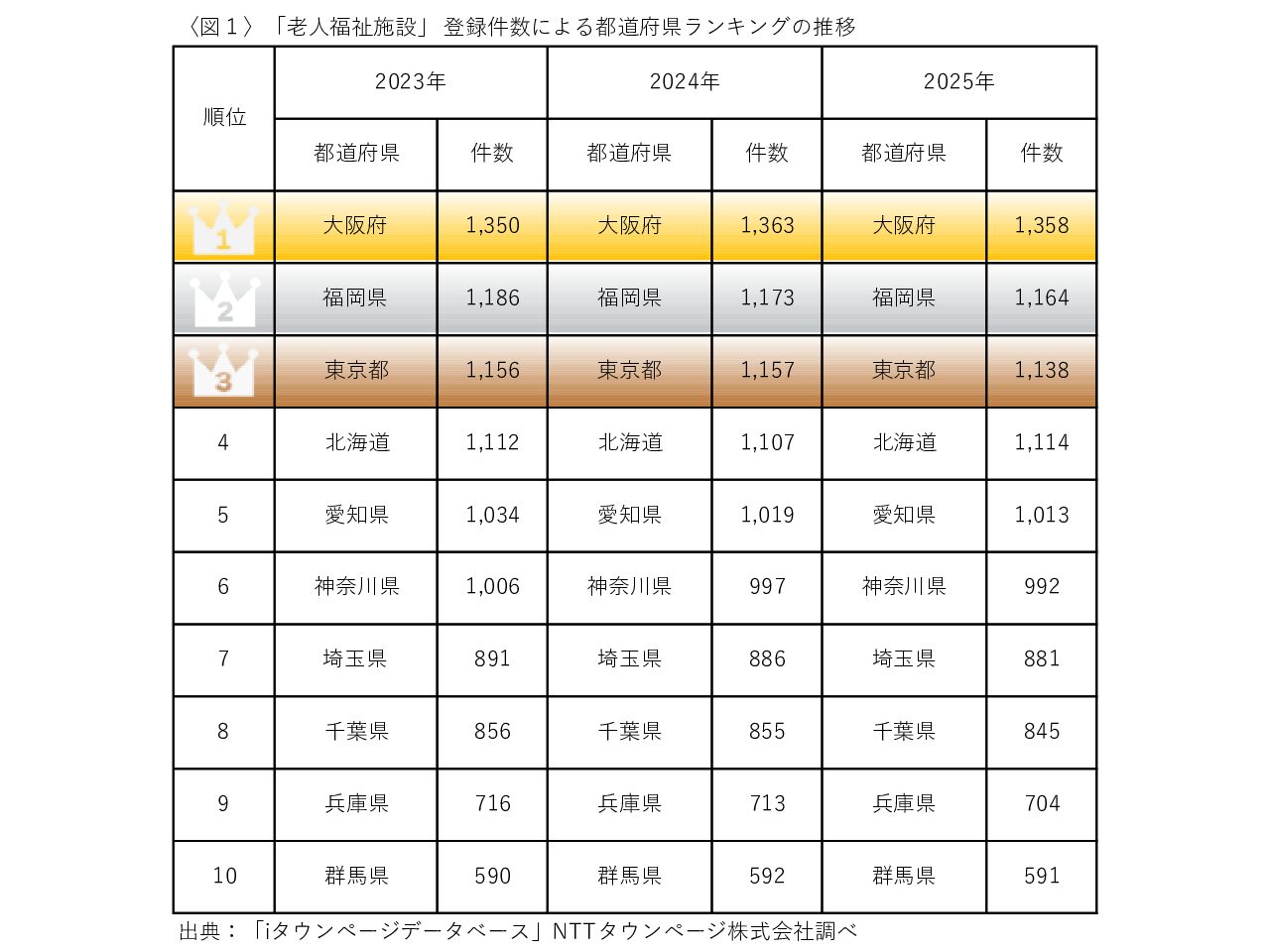 2025年における老人福祉施設の登録件数の多い都道府県は、1位が大阪府、2位が福岡県、3位が東京都となりました。